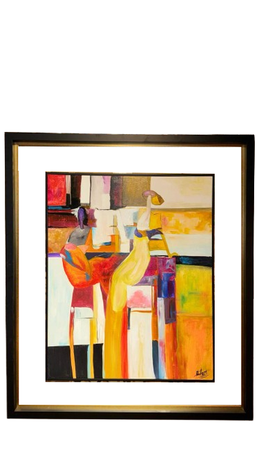 Moldura Preta C/ Vidro e Friso Preto C/ Pintura Pessoas Coloridas Abstrata 122x142cm