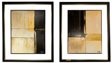 Moldura Preta Champanhe e Vidro C/ Pintura Abstrata Tons Pretos e Dourados 106x127cm