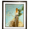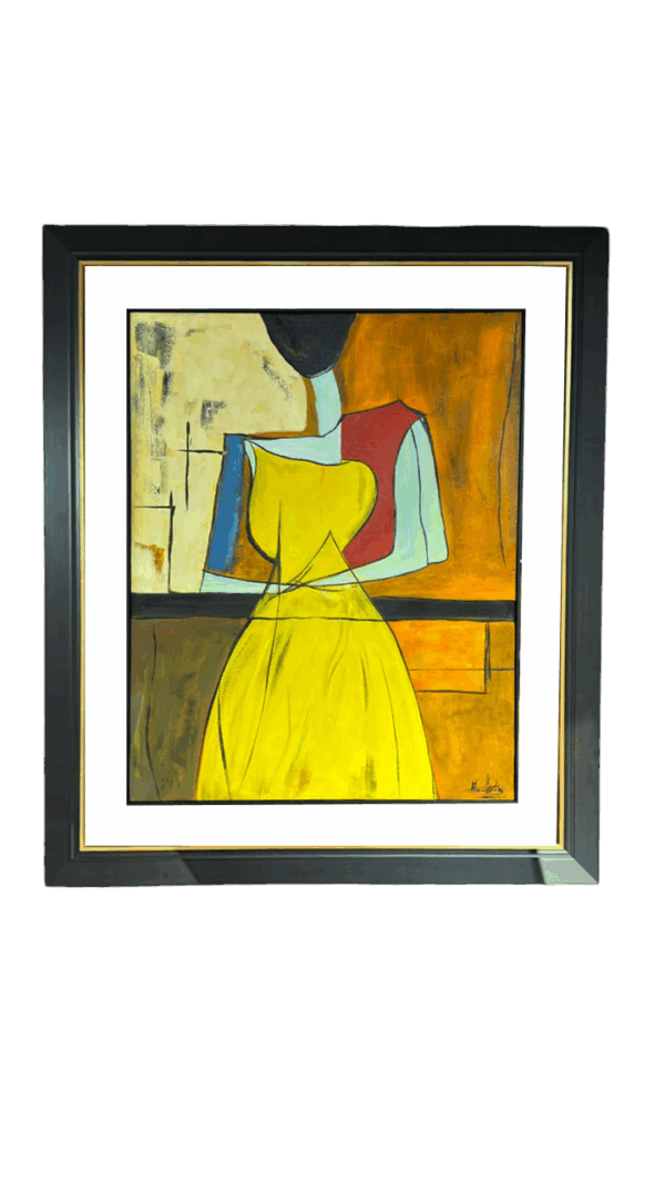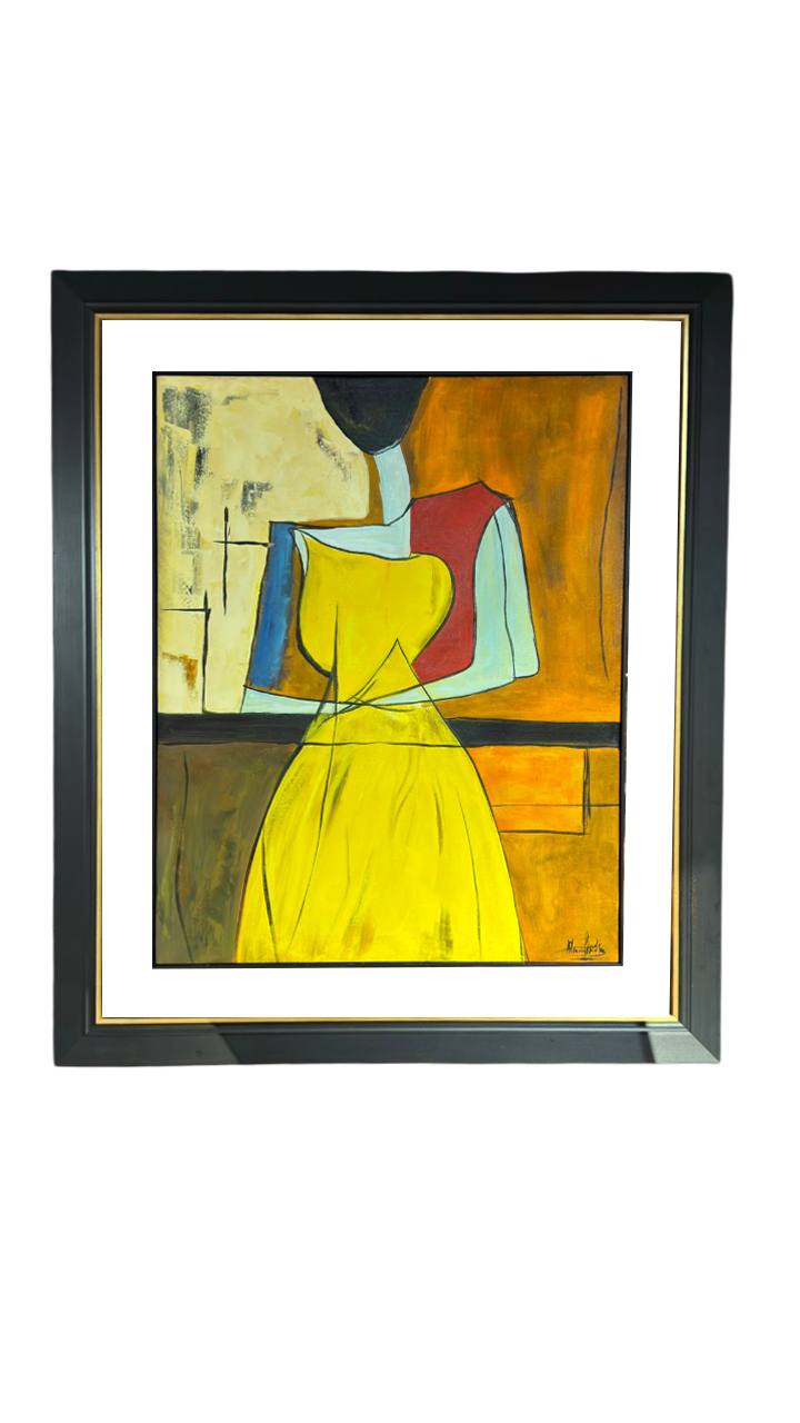 Moldura Preta e Dourada C/ Vidro e Pintura à Mão Mulher Tons Amarelos